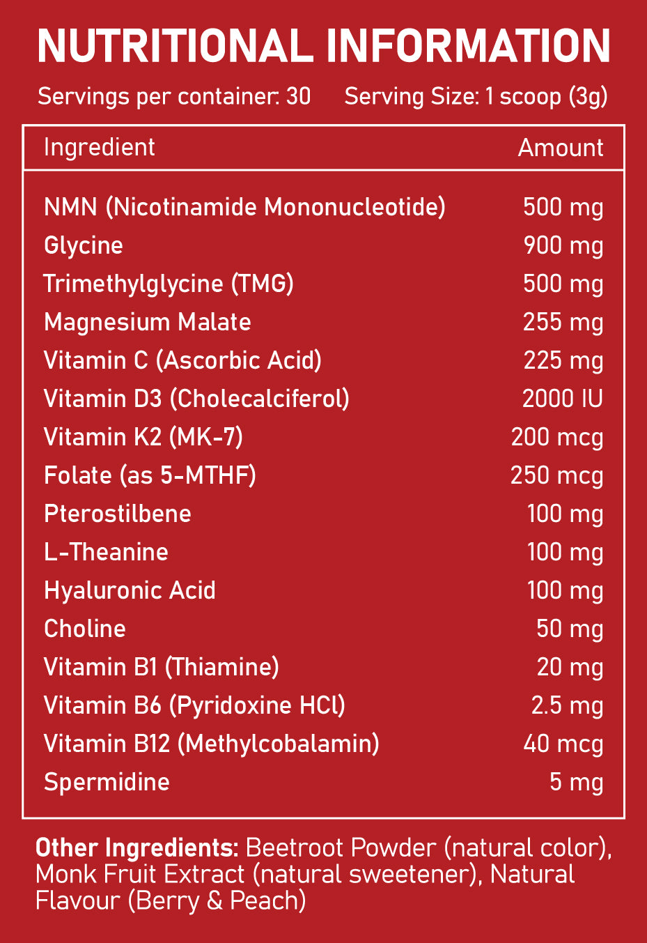 The Daily Longevity Blend is your all-in-one solution for healthy aging and everyday vitality. With 18 premium ingredients—including NMN, Spermidine, Pterostilbene, and essential vitamins—each scoop is carefully dosed for maximum bioavailability and effectiveness. Backed by cutting-edge longevity science, it’s designed to support energy, sleep, brain health, and cellular repair in one simple daily routine.